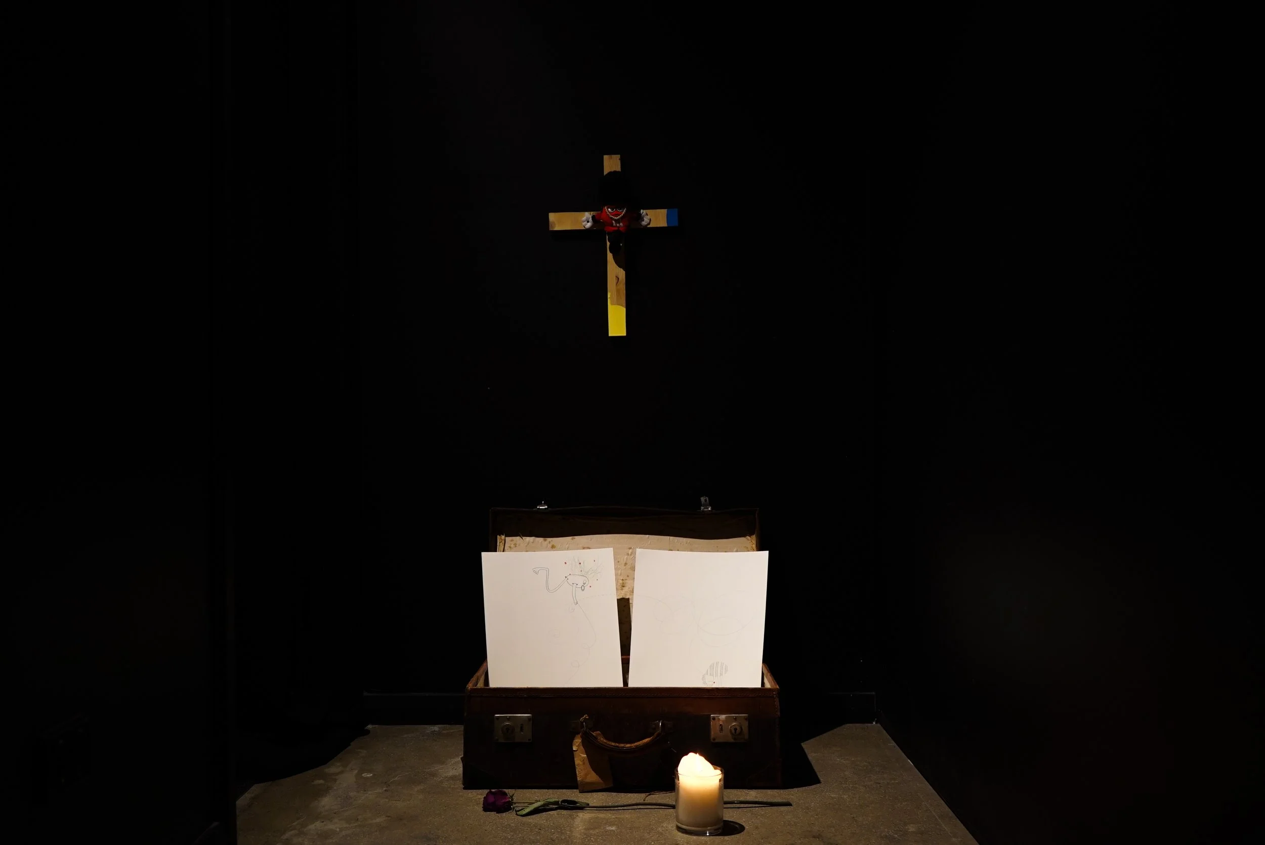 Itching (desiring) and scratching (the beginnings of listening) frames the period in which the work in this show has journeyed. I suffered from a time of blocking my presence from myself. This can sometimes sound like the noise a nail makes in an empty can (if you jumped around with it trying to get attention from yourself and everyone else).